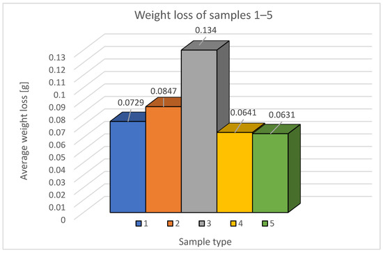 From the measured values of the resistance of the material to abrasive wear, dependences of the weight of the material on the type of fiber deposition strategy in the FFF process were recorded. Table 6 shows the weight losses of the individual samples and the average weight losses under each strategy.