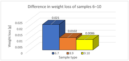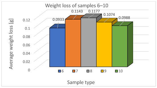When evaluating weight loss and its dependence on the chosen fiber-laying strategy, it can be stated that the largest weight loss occurred in the Z-oriented samples of the deposited fibers in Sample 8, where the fibers were oriented perpendicular to the tested sample wall. In Samples 6 and 7, where the fibers formed a 45° angle, the reduction was 2.89–20.73% lower as compared with Sample 8. In Sample 9, where the layers with perpendicular fibers and fibers parallel to the tested wall alternate, the weight loss was 8.75% smaller as compared with Sample 8. In Sample 10, the weight loss decreased by up to 16.06% as compared with Sample 8. The results of the measured weight losses lead to the conclusion that when using the strategy of 45° in the even and the opposite 45° in the odd layer direction, the smallest weight loss occurs. Using the same strategy in both the even and odd layers, the wear increases (Samples 7 and 8) or when using a combined strategy, the weight loss in the layers decreases in the opposite way (Samples 6 and 9) (Figure 12).