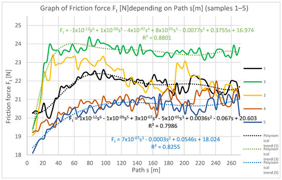 The graph in Figure 10 shows that the friction force increases from the initial value at the beginning of the experiment and stabilizes over a 50–60 m long path, where it then oscillates around a certain value until the end of the experiment. The friction force was lower at the beginning of the testing procedure than at the end of the testing procedure. The lowest friction force at the beginning of the experiment can be observed in Sample 5, which remains the lowest at the end, together with the friction force in Sample 4.