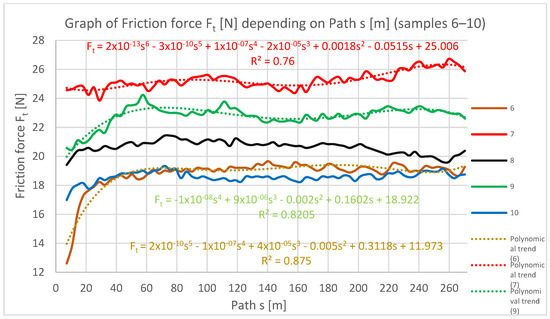 Plotted coefficient of friction depending on the path of Samples 6–10.