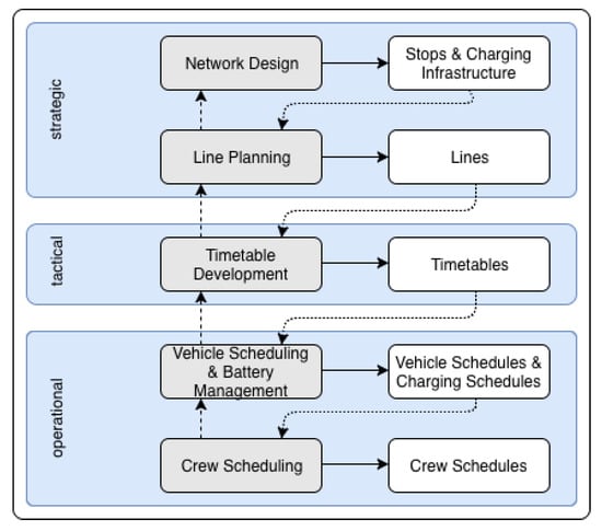 Therefore, construction costs for charging stations as well as the buses’ purchase and operational costs have to be considered at the planning stage. The planning process of public transport companies consists principally of strategic, tactical, and operational planning tasks, which differ with regard to the time periods considered. Figure 1 provides an overview of the planning process. Strategic planning comprises the network design and line planning. The network design determines stop points and necessary infrastructure, particularly including the distribution of charging stations within the road network. In this scope, specific technical aspects such as energy grids’ transmission capacities or restrictions imposed by local conditions may be considered [,]. Within the tactical planning, timetables are constructed according to the previously planned lines. Operational planning determines the deployment of vehicles and personnel.