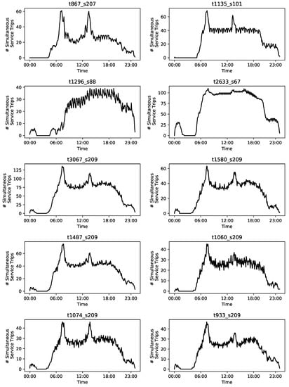 Our computational experiments are performed on 10 real-world instances that are inspired by real-world public transport data. The instances are characterized by different numbers of stop points and service trips as well as different distributions of service trips over a day. To simplify the analysis, the instances’ labels reflect the numbers of service trips and stop points. The instances’ distributions of cumulative service trips over the day are presented by Figure 2. The figure shows that the instances differ substantially with regard to the distributions. It is worth mentioning that the last five instances consist of subsets of the service trips taken from instance t3067_s209 for runtime reasons. In the case of instances t1580_s209 and t1487_s209 the original set of service trips was halved randomly, and in the case of instances t1060_s209, t1074_s209, and t933_s209 the set was divided into three parts also in a random way.