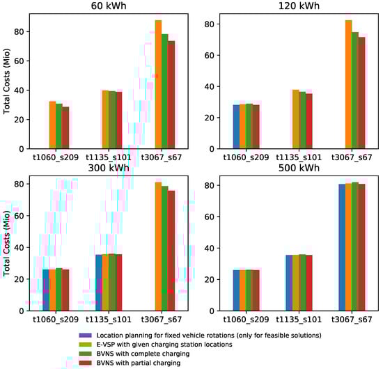 We first compare the results to the first experiment conducted and described in Section 5.2. We observe that in two of the 17 cases, when the first experiment lead to feasible vehicle rotations, the total costs obtained by the application of the savings algorithm were already lower by comparison to solving a location planning problem for charging stations. In the other cases, higher total costs are obtained. In general, the higher total costs arise from higher demands for vehicles needed within the savings algorithm. Regarding each instance, the numbers of vehicles used has increased, which is reasonable due to the heuristic solution procedure of the savings algorithm. The solving of instance leads to the highest increase of . By contrast, the number of charging stations used decreases in every case. In some cases, such as instance , the number of charging stations needed is enormously reduced (30 to two). However, since the costs for additional vehicles prevail over the cost savings arising from the lower number of charging stations used, the total costs increase. This holds true both for complete and partial charging procedures. Regarding these two charging procedures, the total costs obtained are lower in seven of the ten instances for all battery capacities when partial charging procedures are enabled. On average, total cost savings of about are achieved. Only in three cases are the total costs higher when considering partial chargings.