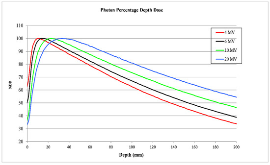 The percentage depth doses from 4, 6, 10, and 20 MV photon beams in a 10 × 10 cm field.