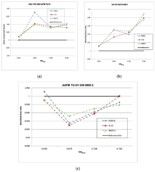 The absorbed dose to water ratios obtained with three ionization chambers: (a) AAPM TG-51/IAEA TRS-398, (b) IAEA TRS-398/DIN 6800-2, and (c) AAPM TG-51/DIN 6800-2.
