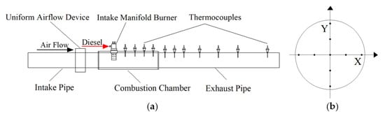 The type-K thermocouples were employed to measure the temperature of the air flow in the exhaust pipe. The measuring points in the cross section are shown in Figure 1b. The thermocouples were installed on the combustion chamber and exhaust pipe with the distance of 50 mm, 95 mm, 140 mm, 185 mm, 230 mm, 275 mm, 320 mm, 365 mm, 420 mm, 488 mm, 550 mm, 655 mm, 775 mm, 925 mm and 1120 mm away from the intake manifold burner, respectively. The temperatures of the points in the horizon axis and vertical axis are marked with “X” and “Y”, respectively. Therefore, the temperature at the center of the cross section was marked with “0”. The temperature at 20 mm below the pipe center is marked with “−20-Y”.
