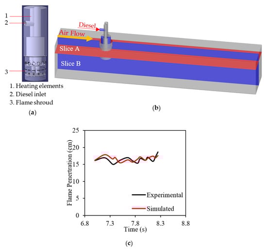 (a) The structure of the intake manifold burner, (b) schematic of the model and (c) the model validation.