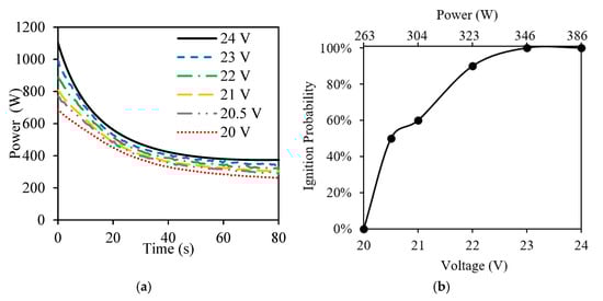(a) Electrical power and (b) ignition probability of the intake manifold burner.
