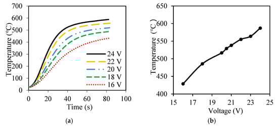 The ignition probability is tested under intake air flow velocity of 1.4 m/s and diesel flow rate of 10 mL/min. The ambient temperature and intake air temperature are 20 °C in this section. The varying trends of the input power of the intake manifold burner under different voltages are shown in Figure 3. The electrical power of the heating elements shows the highest value at the starting time, then decreases with time elapse and reaches a stable value. Figure 4 presents the temperature of the heating rods of the intake manifold burner. With the power supply switching on, the temperature of the heating rods increases with time elapses until a stable value is reached. The electrical power of the intake manifold burner decreases with the decreasing voltage, leading to a lower surface temperature of the heating rods. This leads to poor fuel evaporation, making it more difficult to ignite the fuel-air mixture. Therefore, the ignition probability is 100% under the voltages of 23 V and 24 V, and it decreases significantly from 100% to 0% when the voltage decreases from 23 to 20 V.