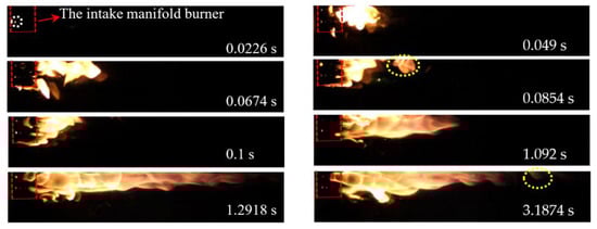 Figure 18 shows the flame propagation under the fuel flow rates of 7.3 mL/min, 15.2 mL/min and 16.8 mL/min, respectively. The air flow velocity, ambient temperature and voltage are 1.4 m/s, 20 °C and 24 V, respectively. With the increase of diesel flow rate, the flame length increases, indicating that the combustion is enhanced. The flame stripping phenomenon is found under different fuel flow rates, denoted by a yellow dotted circle, leading to the abrupt decrease of flame area. The flame plume with an arc shape generates close to the intake manifold burner due to the air entrainment and vortexes, then the flame swirl and rolls in the combustion chamber, leading to the flame stripping.