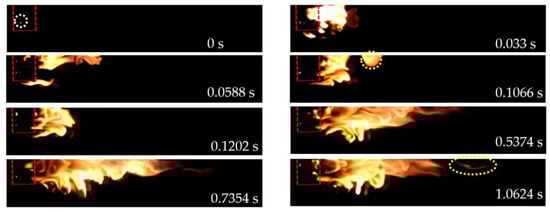 The combustion process under the voltages of 24 V and 20.5 V are shown in Figure 5 and Figure 6. When the fuel-air mixture is ignited, the flame can be seen from holes in the flame shroud at 0 s. Then, the flame rushes out the flame burner, and a flame-developing stage is shown. Eventually, the flame area reaches the maximum value at about 1.2918 s under 24 V and enters the steady stage.
