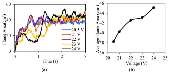 (a) Flame area with time elapses and (b) the average flame area in the steady stage with different power supply.