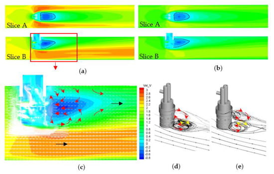 The velocity vector diagram of the intake manifold burner vicinity under 2 m/s is shown in Figure 8c. It shows that two swirl zones with opposite rotation directions, which are noted with the red arrows. In order to obtain the air flow direction, 30 3D streamlines that cross the vertical slice plane A are extracted. The streamlines are three-dimensional distributed in the combustion chamber, as shown in Figure 8d,e. Two vortexes with opposite rotation directions are generated in the vertical plane, which is noted with the red arrows. It is consistent with the vortexes in Figure 8c. While the vortex located below is found to be symmetrically distributed, and the contrary swirl direction is shown, which is noted with the yellow arrows. Because of the complex vortexes and air flow direction in the vicinity of the intake manifold burner, air entrainment and flame swirl motion are generated, leading to flame stripping and instability.