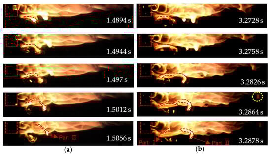 The flame swirl motion is shown in Figure 9 and Figure 10, as denoted by the red dotted lines. The fuel flow rate is 10 mL/min. The flame plume generates with a small arc shape. Then, the small arc develops into a big arc with time elapses. Under the air flow velocity of 2 m/s, the radian of the flame plume increases significantly to the negative velocity zone closest to the intake manifold burner and breaks into two parts eventually. Part I shortens rapidly and fuses with the flame in the vicinity of the intake manifold burner. Part II continues to move downstream and eventually fuses with the ambient flame. However, part I under the intake air flow velocity of 1.4 m/s fuses with ambient flame before it breaks up and makes it difficult to distinguish. Therefore, only part II can be seen. With the increase of air flow velocity, higher occurrence probability of the stripped flame is shown, indicating that the flame swirl motion is enhanced by the strong air flow.