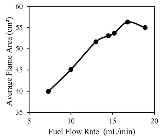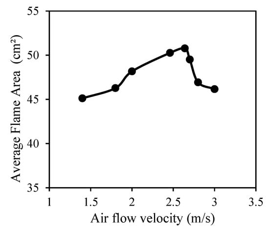 The average flame area (AFA) under different intake air flow velocities during the steady stage is shown in Figure 10. During the steady stage, the flame is more stable than that at the developing stage. The AFA under the fuel flow rate of 10 mL/min increases first and then decreases with the air flow velocity increases from 1.4 to 3 m/s, indicating the hindrance effect of the excessive air flow on combustion. The increasing air flow provides more oxygen and boosts the mixture of air and diesel within 2.64 m/s, enhancing the combustion. In addition, the increasing air flow velocity enhances the air swirl motion and heat dissipation, leading to increased ignition difficulty and combustion deterioration from 2.7 to 3 m/s.