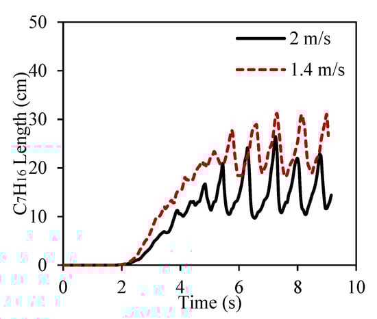 Figure 11 shows the diesel vapor (C7H16) distribution in the combustion chamber. The diesel vapor length in the combustion chamber shows obvious periodic reciprocating oscillation, indicating that the diesel evaporation process is periodic. Compared with the case under higher air flow velocity of 2 m/s, the fuel vapor under 1.4 m/s develops earlier and shows lower amplitude. The periodic evaporation of the fuel vapor is believed to be one reason that leads to flame pulsation and instability.