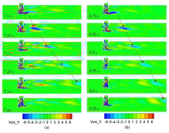 Figure 12 shows the vorticity in the combustion chamber. It indicates that the vortex clusters of the air flow with negative and positive values cross-distribute downstream of the intake manifold burner and move downward along the air flow direction. Therefore, the flame is affected by the negative-value vortexes and the positive-value vortexes simultaneously, leading to the complex flame pulsation and swirl motion. The vorticity under intake air flow of 2 m/s is higher than that under 1.4 m/s, leading to stronger air swirl motion and more violent flame stripping.