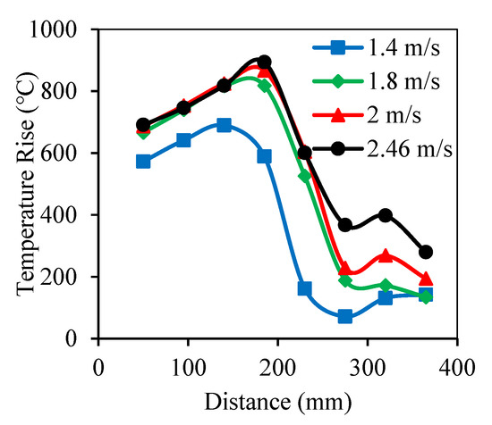 As the air flow velocity increases from 1.4 to 1.8 m/s, the position of the highest temperature rise shifts to 185 mm away from the intake manifold burner, and the temperature rise shows a significant increase. When the air flow velocity increases from 1.8 to 2.46 m/s, the position of the highest value remains constant, while the temperature rise shows a slight increase within 230 mm. Excessive heat is carried away by the air flow due to the forced heat convection, neutralizing the boost effect of the increased oxygen concentration and leading to a smaller temperature rise. The maximum flame length is about 25 cm in all the cases. Thus, the temperature rise within 250 mm reflects the flame temperature, while the temperature rise from 275 to 365 mm shows the air flow temperature. An obvious temperature rise from 275 to 365 mm is shown in Figure 13, indicating that though the promotion on combustion is neutralized by the forced heat convection, a better preheating effect can still be obtained.