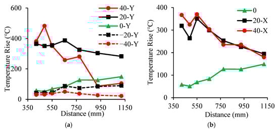 The temperature rise at (a) y-axis and (b) x-axis in the exhaust pipe under the fuel flow rate of 13 mL/min and air flow velocity of 10 m/s.