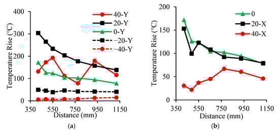 Compared with the case under the air flow velocity of 2 m/s, the temperature rise is lower under 10 m/s due to more heat dissipated in the air flow, as shown in Figure 15. With the increasing distance from the combustion chamber, the temperature rise of the vertical axis shows an overall decreasing trend because more heat is carried away by the high-speed air flow. The data of “20-Y” shows the highest temperature rise in the vertical axis, while the data of “0” and “20-X” show much higher temperature rise than that of “40-X”, indicating that the warm gas mainly distributes in the upper region and center zone of the exhaust pipe. Compared with the case under 2 m/s, the warm air is concentrated in the zone closer to the central zone under 10 m/s due to the stronger heat convection and dissipation.