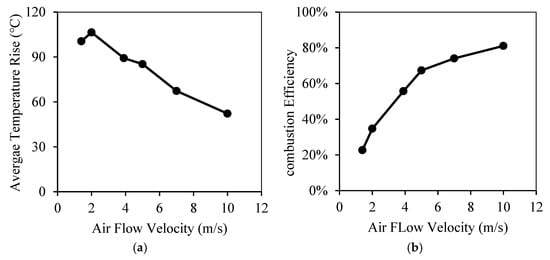 The average temperature rise and combustion efficiency under different air flow velocities are shown in Figure 16. With the air flow velocity increasing from 1.4 to 10 m/s, the average temperature rise first increases before decreasing, indicating that the combustion is promoted within 2 m/s. Excess air flow hinders the combustion when the velocity exceeds 2.64 m/s, and the stronger air flow leads to higher heat dissipation. Thus, lower air flow temperature rise is shown from 3.9 to 10 m/s. However, the combustion efficiency increases due to the increased air flow volume.