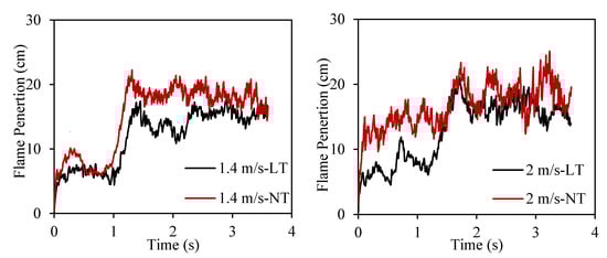 The flame penetration under the intake air temperature of normal temperature (20 °C, NT) and low temperature (LT, −9 °C) is shown in Figure 17. Lower intake air temperature has a negative effect on combustion due to the deteriorating diesel evaporation. The average temperature rise and combustion efficiency under low temperature are 96 °C and 33.7%, which are lower than that under normal temperature. The flame stripping phenomenon shows the same occurrence probability, indicating that the flame stripping is irrelevant to the intake air temperature.