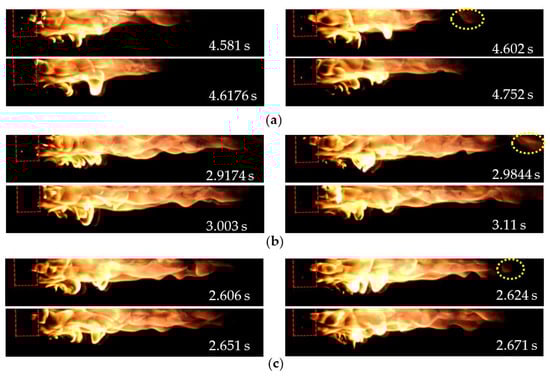 The flame propagation under the fuel flow rate of (a) 7.3 mL/min, (b) 15.2 mL/min and (c) 16.8 mL/min.
