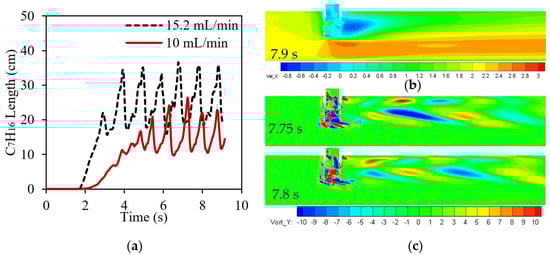 (a) The diesel vapor length with time, (b) the velocity field and (c) the vorticity under the fuel flow rate of 15.2 mL/min.