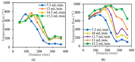 Figure 21 shows the preheating effect of the fuel flow rate on the temperature rise in the combustion chamber. When the air flow velocity is 1.4 m/s, the temperature rise of air flow shows a notable increase with the increasing fuel flow rate within 14.5 mL/min. However, the temperature rise of the flame shows a slight increase when the fuel flow rate increases from 14.5 to 15.2 mL/min, and the air flow temperature remains the same, indicating that the promotion effect of flow rate reaches its limit. Under the air flow of 2 m/s, when the fuel flow rate increases from 7.3 to 15.2 mL/min, the temperature rise increases significantly, and the position of the highest value shifts away from the burner, meaning the combustion is boosted and the flame length increases.