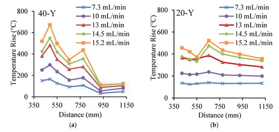 Figure 14 presents the temperature rise in the exhaust pipe under the fuel flow rate of 13 mL/min and air flow velocity of 2 m/s. When the distance from the intake manifold increases from 420 mm to 1120 mm, the temperature rise of “40-Y” and “20-Y” decreases due to the thermal convection and dissipation. While the temperature rise of “0” and “−20-Y” shows an increasing trend, indicating that the lower region receives the heat transfers from the high temperature zone. However, the temperature at the point with 40 mm below the circle center, that is to say, the temperature rise of “−40-Y”, shows very slight fluctuation because most heat is dissipated before it arrives. The heat mainly concentrates in the upper zone due to the thermal buoyancy effect of the flame, then the heat transfers to the cold air, leading to decreasing temperature difference of adjacent points. Thus, the heat distribution becomes more uniform with the increasing distance from the intake manifold burner.