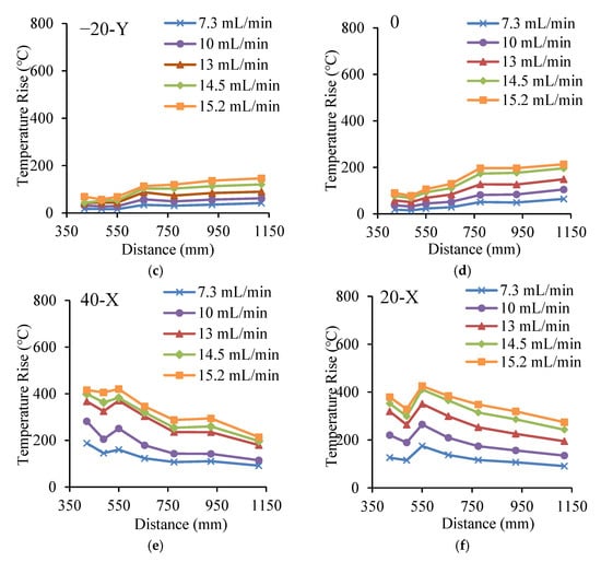The temperature rise of individual temperature-measuring points at the point of (a) 40-Y, (b) 20-Y, (c) −20-Y, (d) 0, (e) 40-X and (f) 20-X in the exhaust pipe under the air flow velocity of 2 m/s.