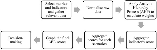 In this section, the selected metrics and assessment methods are described. This paper analysed various development scenarios using the EMP framework, with a focus on the 3BL approach and highlighting the three pillars of sustainability: economic, environmental and social.