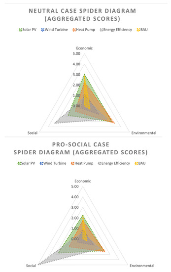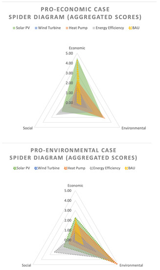 In Step 4, the aggregated scores were dependent on the weights that were calculated for each of the performance indicators without considering the scenarios, such as base (or neutral), pro-economic, pro-environmental and pro-social. To analyse each of the scenarios, the fifth step was to use the AHP again to determine the weight of each 3BL metric. The calculated weights of the 3BL metrics were multiplied by the aggregated scores from Step 4 to obtain the scenario scores (Step 5). A spider diagram was generated to visualise the scores for each of the scenarios (Step 6). Finally, based on the aggregated scores, the technology share or portfolio was assessed to match the energy demand of an area with a goal to reduce GHG emissions to net-zero. The input data (i.e., electricity demand and current/projected GHG emissions) were needed to determine the percentage share of the technology that is required for the development. A decision could then be drawn from the result and the SDGs that are met by these priority technologies could be mapped.