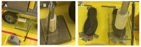 The measurement of gamma radiation of Sr-85 from the testing surfaces was performed using a sodium iodide (NaI) spectrometer (Canberra InSpector 1000, Canberra Industries, Inc., Meriden, CT, USA) with different customized stand frames (Figure 2) made of Plexiglass® to ensure a constant distance (1.27 cm) between the detector and the measured surfaces. After applying Sr-85 contaminated particles to the testing surface or following the application of stabilization technologies on the contaminated surfaces, the center of the contaminated area was measured for the activity of Sr-85. To track the transfer of Sr-85 as the result of the movement of simulated vehicles and walking, the contaminated/stabilized surfaces, transferred surfaces that were previously uncontaminated surfaces, and the tires/boots were measured for the activity of Sr-85 after rolling simulated vehicle/walking across the surfaces. The instrument performance testing of Canberra InSpector 1000 was conducted daily and met the acceptance criteria. Specifically, the instrument’s accuracy was monitored through daily performance checks, which included analysis of a sealed sample of 1 µCi Sr-85. The sealed sample was analyzed in the same geometry with respect to the probe with a 100-s acquisition time. The instrument performance was considered consistent if the relative percent difference (RPD) of the measured activity and the theoretical value of Sr-85 prepared due to decay were within 10% throughout the testing. Based on the half-life of Sr-85 (64.8 days), the theoretical values were calculated on each experiment day. Across the two months of testing, the RPD ranged from -2.4% to 2.5%, indicating the consistency of instrument performance.