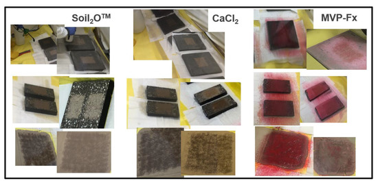 The stabilization technologies were applied to the surfaces studied as described below, and the exact application varied with the type of experiment and the specific surfaces involved. As an example, Figure 3 shows the stabilization technologies for treated surfaces before and after drying. Figure 3 is intended to highlight the appearance of the technologies, whereas later figures illustrate the steps of evaluating the technologies.