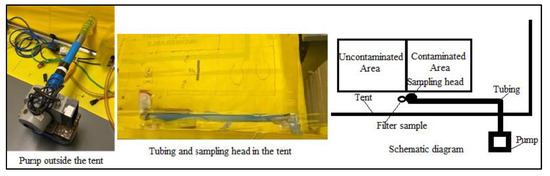 Schematic Diagram of High-Volume Sampler and Filter Sample Setup (left); with pictures of the pump (right) and tubing and sampling head (middle) to show a relationship to the containment tent.