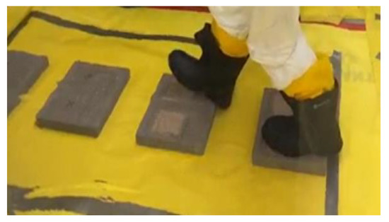 For foot traffic experiments, similar testing was performed with technicians wearing rubber boots (Item: Dunlog 86020, https://www.dunlopboots.com/, accessed on 9 April 2022) while walking across the testing surfaces. As with the simulated vehicle experiments, approximately 3 g of Sr-85 contaminated particles was applied to each testing surface with a surface area of 12.5 cm × 15 cm using a template. Four (4) contaminated surfaces were prepared for each testing surface as experiment controls. For stabilization technology testing experiments, the testing surfaces were dosed first with Sr-85 contaminated particles. After the surface was contaminated, a stabilization technology solution was sprayed onto the contaminated surfaces using a sprayer and allowed to dry (drying time ranged from overnight to 3 days, as the surfaces did not all dry completely overnight). CaCl2 and Soil2O solutions were also sprayed using a 2 gallon, multipurpose Scott’s sprayer with the cone spray setting. Phos-Chek MVP-Fx solution was sprayed using the same 0.5 gallon, multipurpose handheld sprayer as described above. Four (4) contaminated surfaces treated with each stabilization technology were prepared for each testing surface. The Sr-85 contaminated surfaces treated with/without stabilization technologies were tested first by walking across alternately placed contaminated surfaces, with one footstep on each surface, and subsequently onto previously uncontaminated surfaces (Figure 7 and Video S2). The boots were taken off and placed on a customized boot stand. The contaminated surfaces were measured for activity before and after walking. The activity of previously uncontaminated surfaces and Sr-85 transferred to the boots was measured.