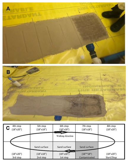 For the sand circuit walking path surfaces, the walking path included a contaminated sand surface (45 cm × 45 cm) connected with an uncontaminated surface (1st step and 2nd step including transfer surfaces, 45 cm × 90 cm) and non-sand surface (3rd step to 8th step and Start/Stop point). Figure 8 shows the post-walking condition of the control experiment and the walking path schematic diagram, and Video S3 shows an example experiment. To prepare the sand walking path, a premeasured amount of approximately 11 kg of loose sand was evenly distributed onto the defined area, including the contaminated area and the 1st step and 2nd step area. Approximately 40 g of Sr-85 contaminated particles were applied to the contaminated area of the walking path. To stabilize the contaminated surfaces, CaCl2, Phos-Chek MVP-Fx, and Soil2O solutions were sprayed using sprayers, as mentioned previously. One NSC experiment was contaminated with Sr-85 particles but was not sprayed with any stabilization technology. The other three experiments were performed similarly, but the contaminated surfaces were treated separately with the three stabilization technologies. The experiments were conducted to take the 1st step onto one-half of the 45 cm section of contaminated sand (with or without stabilization technologies). The next two steps were onto two (2) 45 cm sections of previously uncontaminated sand, followed by the remainder of the loop on the previously clean Herculite surface. Each time the walker stepped onto the contaminated surface, they alternated which foot they started with to keep the potential transfer as similar as possible. The walking path experiment was conducted for 5 continuous minutes (in the same direction) for approximately 36 passes.