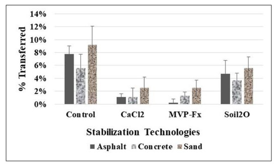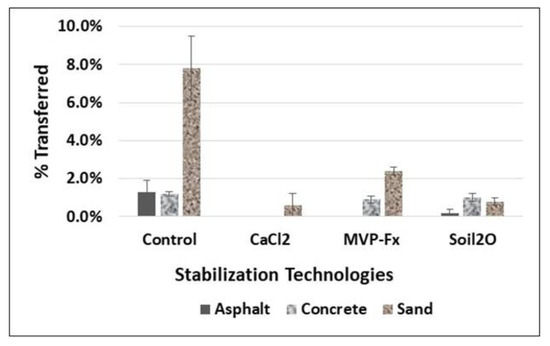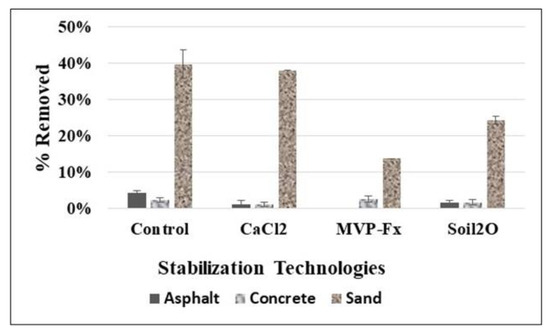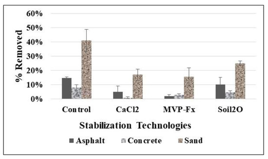 Removal percentages, with or without stabilizers, were higher from the soil than from asphalt or concrete. Therefore, stabilization of contaminated soils surfaces can represent an important goal for stabilizer application. The data and statistical analysis presented can aid in selecting appropriate stabilizers because they indicate the potential for stabilization techniques to enable operations in contaminated areas. In addition, the process of performing the studies revealed numerous operational details and observations for each of the stabilization technologies pertaining to application, surface material interactions, health and safety concerns, and estimated cost. These are summarized in Tables S1–S3 for each of the three stabilizers.
