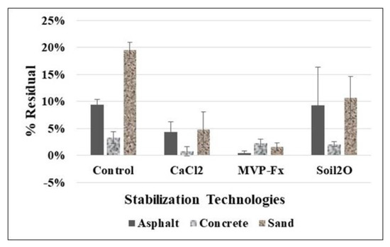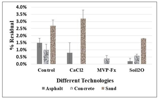 Asphalt. CaCl2 (4 ± 2 %Res) and MVP-Fx (0.5 ± 0.4 %Res) resulted in significantly decreased %Res compared to the NSC (9 ± 1 %T), while Soil2O (9 ± 7 %Res) did not. MVP-Fx (0.5 ± 0.4 %Res) demonstrated significantly lower %R than CaCl2 (4 ± 2 %Res), and both of those produced less %Res than Soil2O (9 ± 7 %Res). However, the difference between MVP-Fx and Soil2O was not statistically significant (likely due to the relatively high variability of the Soil2O result).
