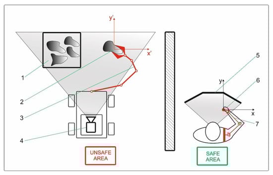 The most common intuitive control is to track the location of the characteristic points of the shoulder, elbow, and wrist [,], or the hand itself [,,]. In the first case, all parts of the manipulator repeat hand movements, while in the second, only the effector is given the movement parameters, and the remaining parts of the manipulator adjust their position on the basis of established algorithms. This method is also used to control redundant manipulators [,,]. Depending on the size of the controlled manipulator and its work area and the range of used hand movement, the measured displacements may be multiplied or reduced in order to ensure the intuitiveness of the control room and high work efficiency [,]. The control signals can also be modified in order to increase the accuracy of the manipulator’s movement or to limit the dynamic loads [,].