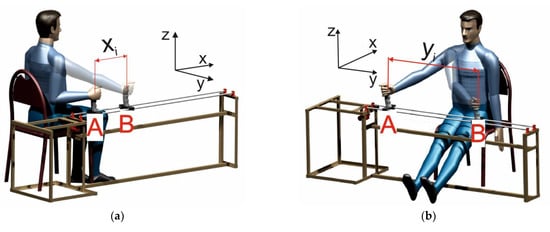 The operator’s task during the study of reaching movements was to move the handle ((2) in Figure 2) from the adopted initial position to the fixed end position, defined by flexible bumpers mounted on the guides. The operator’s task was to make a one-way movement and return to the position close to the initial position, with a normal hand movement speed. For each type of movement, the position of the guides (3) and bumpers (5) (Figure 2) was changed. Due to the ergonomics of hand movements [,], it was assumed that the distance between the bumpers for longitudinal movement (xi) is 430 mm, for transverse (yi) it is 730 mm, and for vertical (zi) it is 930 mm (Figure 2). The basic measuring element of the test stand was a linear encoder with a measuring range of 0–1.25 m and an accuracy of 0.625 mm [].