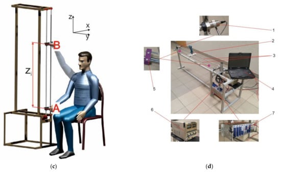 Studies of reaching hand movements: (a) longitudinal movement tests; (b) lateral movement tests; (c) vertical movement tests; (d) test stand: 1—linear encoder, 2—moved element (handle grabbed by the operator’s hand), 3—guides, 4—data acquisition device, 5—spring stop, 6—power supply, 7—measurement card, A—starting point, B—point determining the goal of the movement.