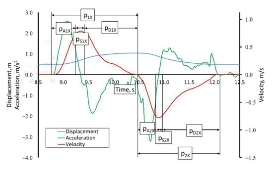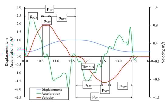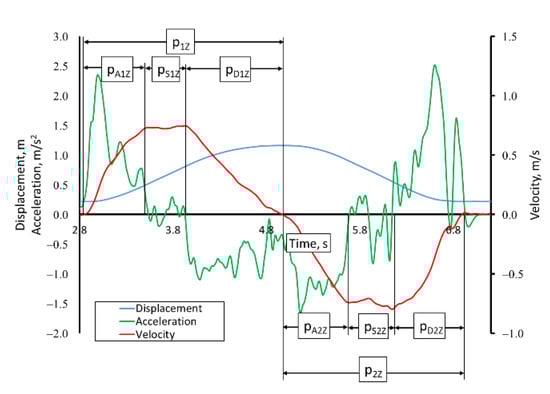 Analyzing the presented waveforms (Figure 5, Figure 6 and Figure 7), two stages of movement can be distinguished. The first is related to the movement to achieve the goal (point B in Figure 2); the other is for getting back to the starting position (point A). At each stage of movement, one can observe: an acceleration phase—pAkl, a steady motion phase—pSkl, and a deceleration phase—pDkl, where l refers to the type of movement (longitudinal—x, lateral—y, and vertical—z), and k designates the movement (1—motion to achieve the target, 2—return movement). The steady motion phase is considered a period when the speed does not change by more than 5%. It should be noted that, with the shortening of the length of motion, the steady state phase decreases. For small displacements, it may disappear.