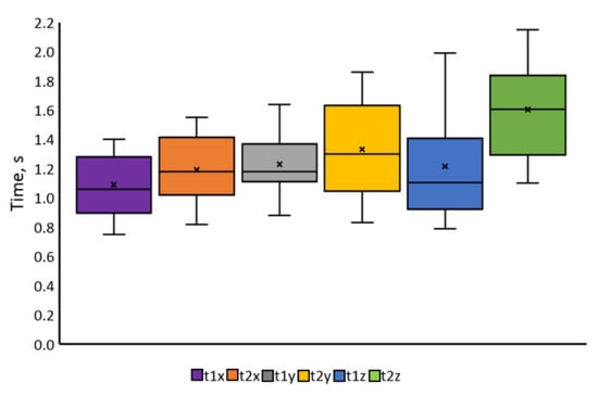The values of the duration of the first (movement to the target) and second stage (return movement) of the hand movement during the tests for all operators are summarized in Figure 8. A box plot to show the distribution of the dataset was used. In a box plot, numerical data are divided into quartiles, and a box is drawn between the first and third quartiles, with an additional line drawn along the second quartile to mark the median. The minima and maxima outside the first and third quartiles are depicted with lines, which are often called whiskers. The mean value is marked by an x. They show that the average time for the return movement is usually longer—differences amounted to 9% for lateral movement, 10% for longitudinal movement, and 20% for vertical movement. The ANOVA F [] analysis showed that there are no significant differences between the time of movement to the target and the time of return for longitudinal movement (F (1.238) = 3.469, p = 0.07) and lateral movement (F (1.238) = 2.43, p = 0.12). For the vertical motion, F (1.238) = 19.32 and p < 0.05, indicating the significance of the difference between the time of movement to the target time and the return movement of large displacement.