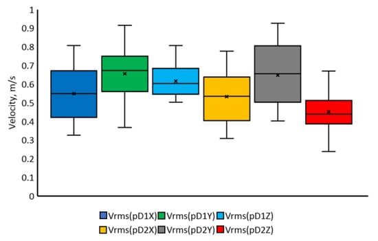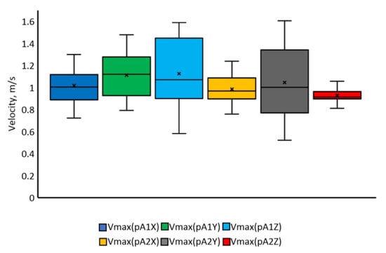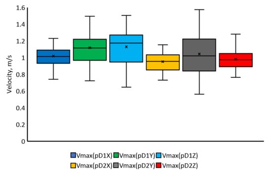 The values of velocity and acceleration of the human hand for both types of tests were determined based on the backward differential quotient. The relationship that us allows to determine the speed takes the form [,]:
