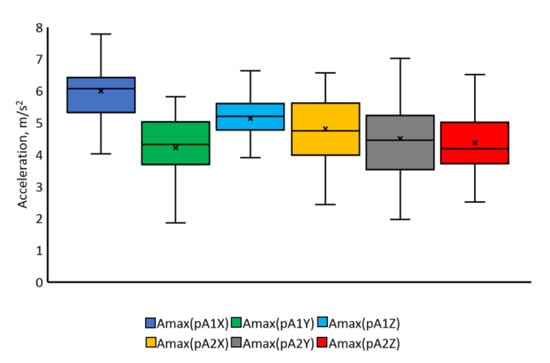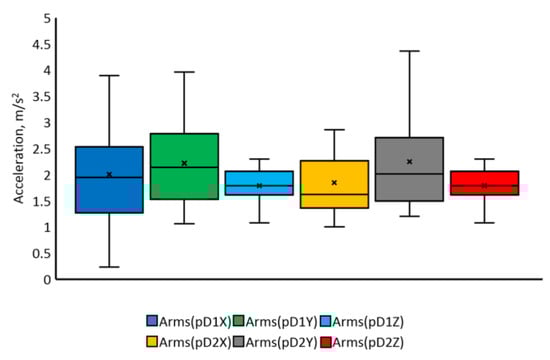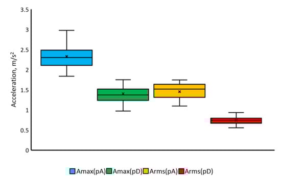 The summary of the values of maximal accelerations and RMS (Root Mean Square) accelerations obtained during the study of reaching hand movements during the acceleration phase and the deceleration phase is shown in Figure 13, Figure 14, Figure 15 and Figure 16.