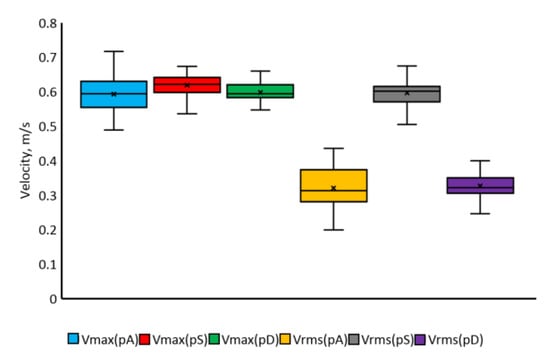 ANOVA analysis showed that the direction of the performed movement (vertical, lateral, and longitudinal) influences the maximal speed of movement: F (2; 357) = 5.35 for p = 0.006. Based on the results of the research on reaching movements, the average values of maximal speeds and maximal accelerations, as well as average values of RMS speed and RMS accelerations for the acceleration phase—pA, steady motion phase—pS, and deceleration phase—pD were determined. The calculated parameters are summarized in Table 1.