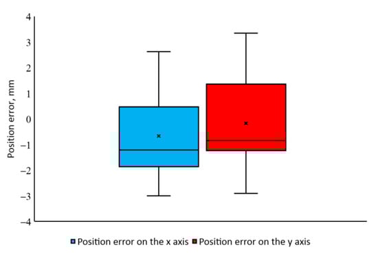 The compilation of the dropout errors in relation to the x and y axes obtained during the tests by all operators is shown in Figure 20. Analyzing the obtained test results (Figure 20), it can be noticed that the average error of putting the object off does not exceed 0.5 mm. The first quartile of the withdrawal error concerning the x axis is −1.8 mm, and the third quartile is 0.5 mm. The yaw-off error to the y-axis for the first quartile is 1.2 mm, and for the third is 1.3 mm. Therefore, no less than 50% of attempts to complete the task were carried out with the assumed accuracy.