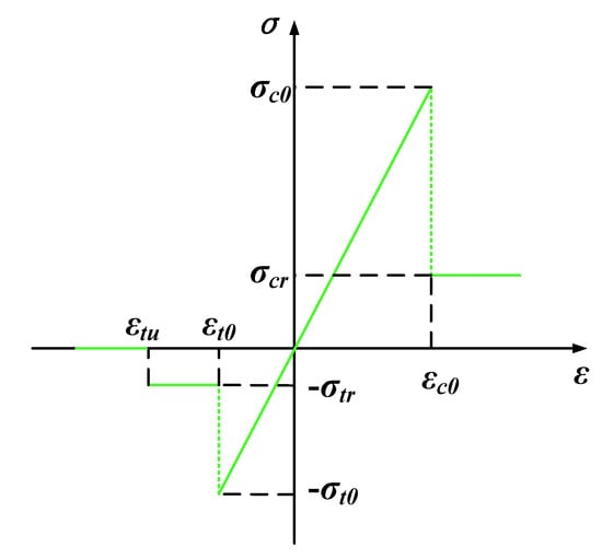 It is initially linearly elastic until the specified damage threshold is reached. This study has calculated the damage thresholds using the maximum tensile strain criterion and the Mohr–Coulomb criterion. As expressed in Equation (2), the maximum tensile strain criterion primarily determines whether a crack has been initiated. The second damage threshold, defined in Equation (3), is the Mohr–Coulomb criterion, which determines whether an element is damaged in the shear mode in the absence of tensile damage.